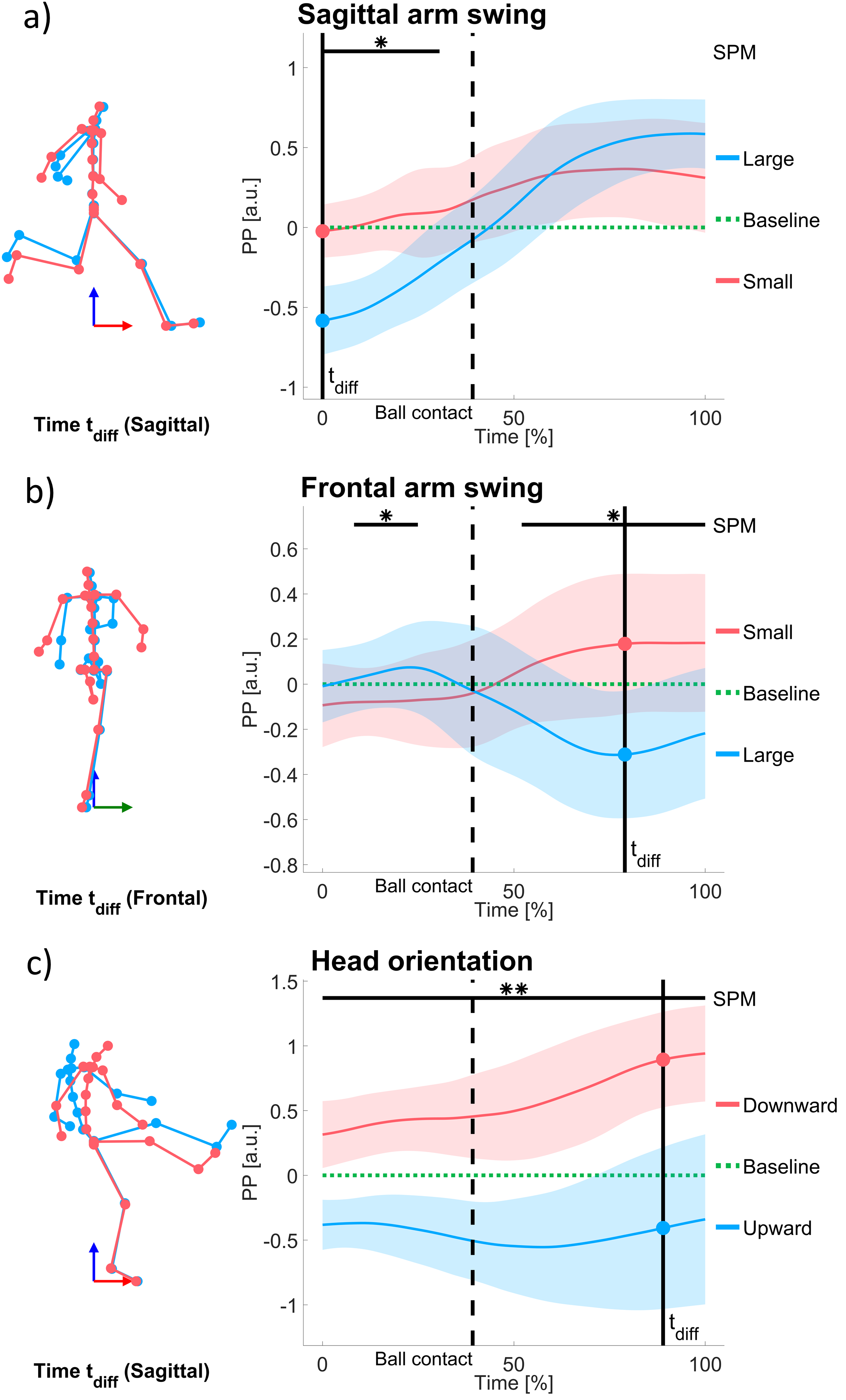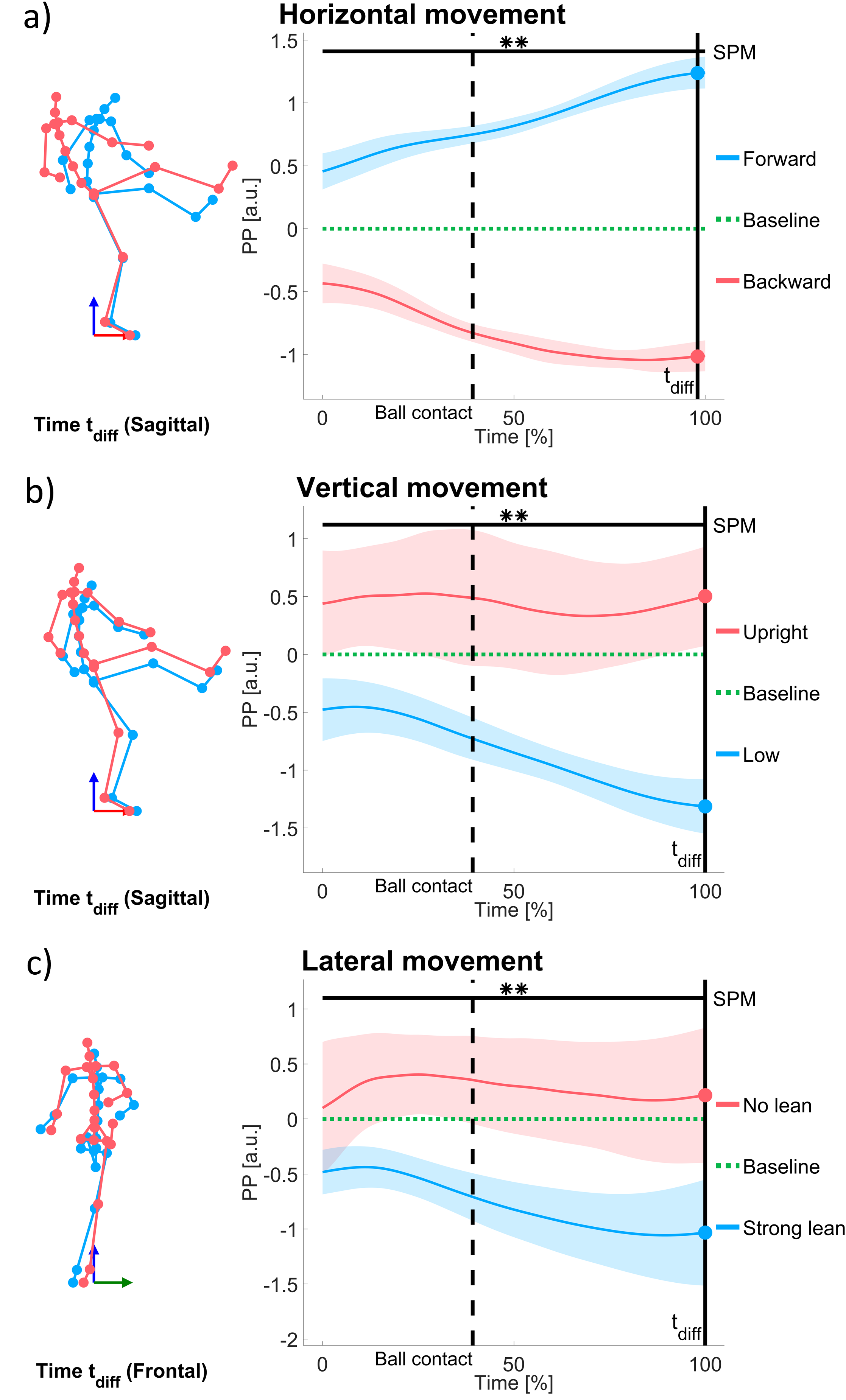 Horizontal movement: Figure fig. 3a displays the PP waveforms for the instructed forward and backward upper body lean on the PC representing horizontal movement deviations relative to the baseline kick. The baseline kick has a PC score of zero since the body position of the baseline movement execution was subtracted from each trial per time step. SPM confirmed a significant difference between forward and backward lean throughout the entire kicking motion (p < .001 between 0.0% and 100.0%). The maximum difference occurred at the end of the analyzed sequence. The body configurations associated with the PPs at this time step of maximal difference are shown as stick figures (Figure fig. 3a).