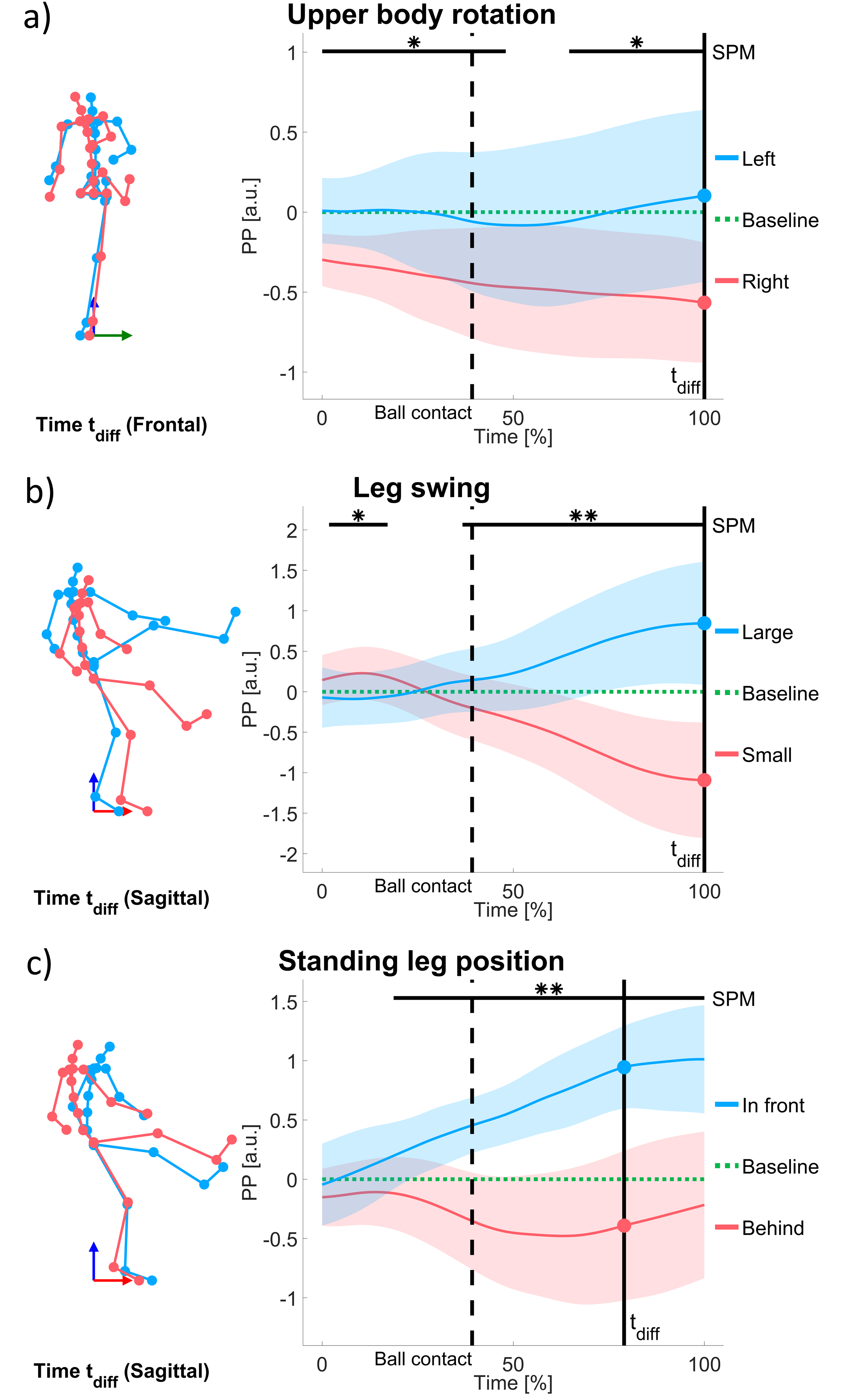 Each component is derived from a PCA that included two contrary extreme technique executions (a: forward vs. backward lean; b: low vs. upright hips; c: strong vs. no lateral lean to the standing leg side), performed by experienced soccer players (N = 16). On the right of each panel, mean (bold line) and standard deviation (shaded area) of the time-evolution of the PC score (termed principal position, PP) of these two extremes along the respective technique component are plotted (red and blue). PPs represent deviations from the mean baseline kick without any technique instructions (zero deviation shown as dotted green line). On the left of each panel, body postures associated with the PP value at the time point of maximal difference (tdiff) are shown. Statistical parametric mapping (SPM)-based significant differences between the PP waveforms are indicated by horizontal lines over the corresponding time periods (**: p < .001; *: p < .05).