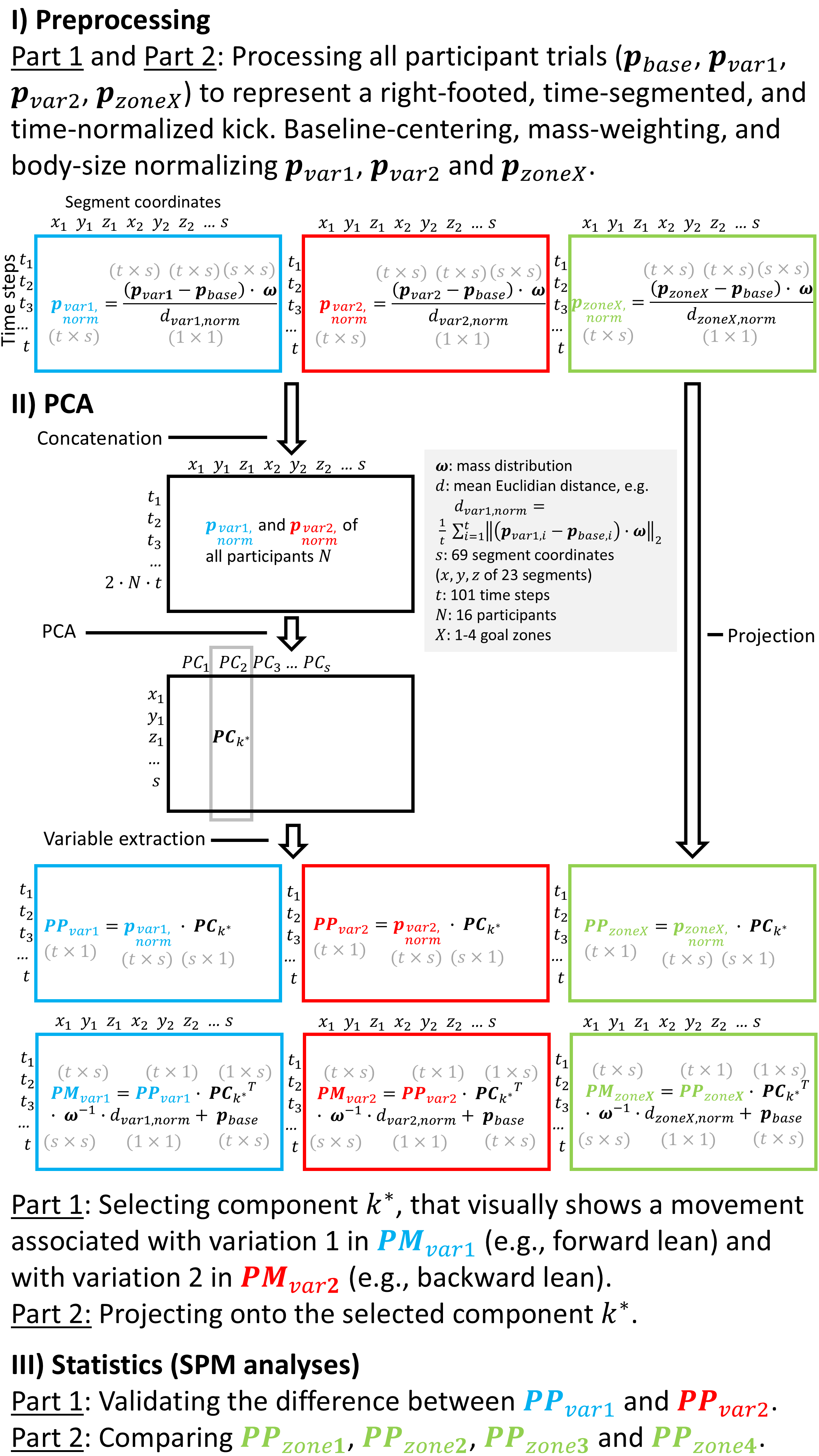 The same procedure was repeated for all nine variation pairs (Table tbl. 1). Segment position data obtained from the Xsens system were pre-processed (right-foot mirroring, temporal segmentation, and time normalization) for the baseline trials (pbase), contrasting variation trials (pvar1 and pvar2) and the goal-zone-targeted trials (pzoneX). Each trial matrix p contains the segment data over time (t × s). The pre-processed data was baseline-centered, weighted by segment mass distribution (de Leva, 1996), and normalized by the mean Euclidean distance (Federolf, 2016). For Part 1, normalized trials of the two instructed variations (e.g., forward vs. backward lean) were concatenated across participants to form the PCA input matrix. One principal component (PC) was selected based on visual inspection of the corresponding principal movements (PMs) using stick-figure animations and subsequently validated using SPM analyses of the associated principal positions (PPs). For Part 2, normalized trials targeting four goal zones (lower right, lower left, upper right, upper left) were projected onto the selected PC, and the resulting PPs were statistically compared using SPM.