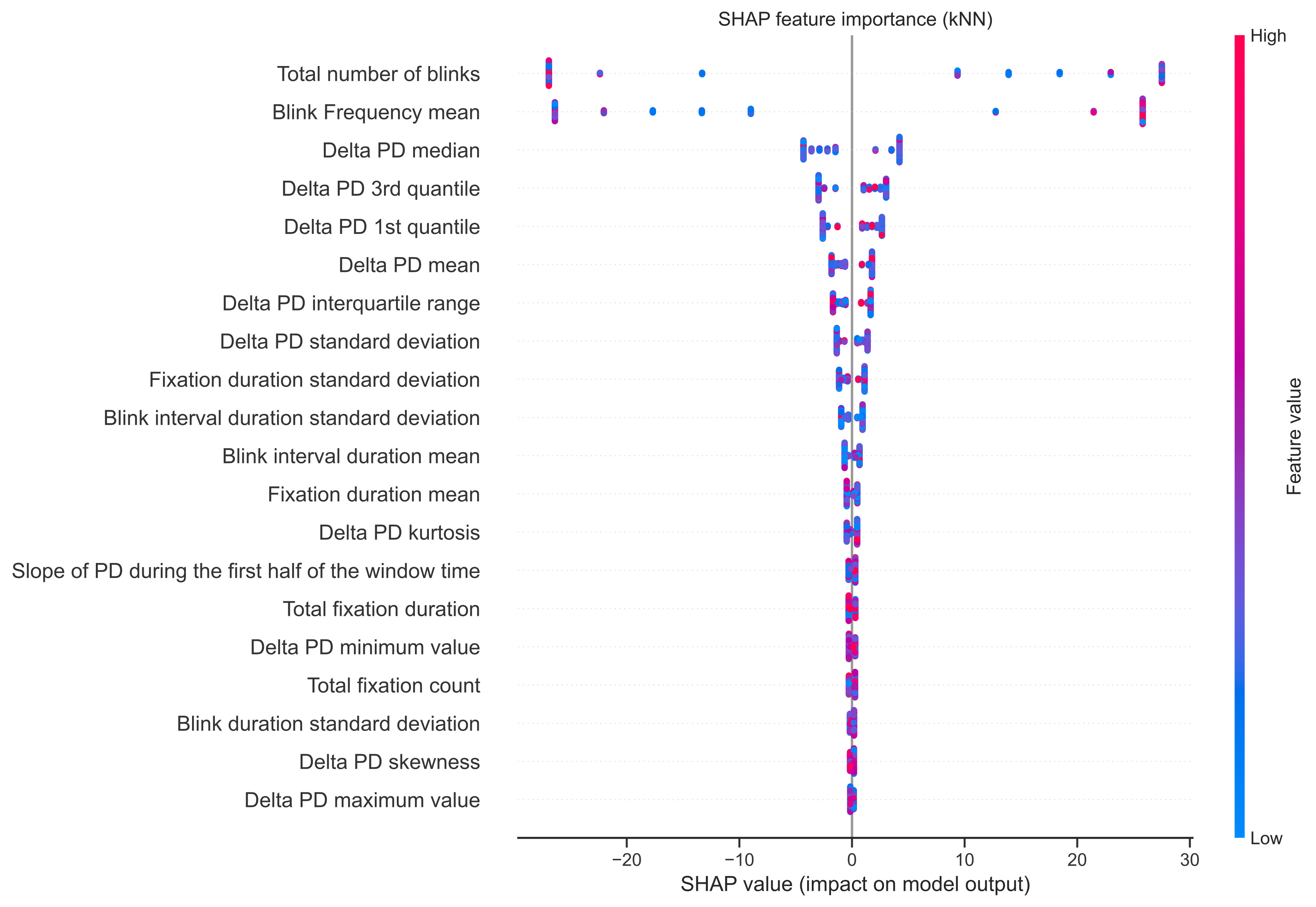 fig. 4 presents the SHAP summary plot for the best-performing kNN configuration. The analysis identified the total number of blinks (36.86 %) and the mean blink frequency (35,54 %) as the dominant predictors for the model predictions, while PD-related features contributed approximately 20 %. A visual inspection of the SHAP value distributions reveals distinct directional patterns. For blink frequency, lower feature values (represented by blue dots) are associated with negative SHAP values, thereby shifting the prediction toward the Gamified scenario. In contrast, the total number of blinks shows an inverse pattern, where lower values are partially associated with positive SHAP values, corresponding to predictions of the Non-Gamified class.
