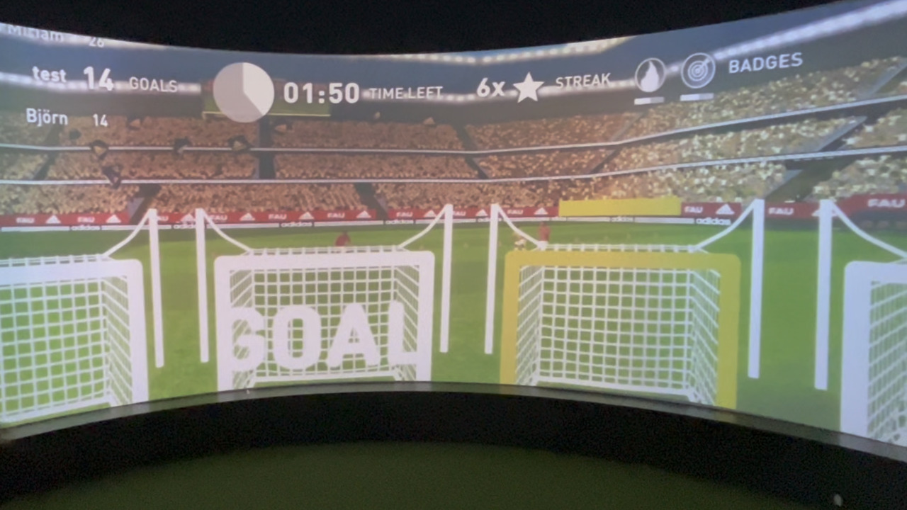 Data recording took place inside the Igloo environment, which was implemented and controlled via a custom Python-based script integrated into the Unity game engine (Unity Technologies, San Francisco, USA). While the projected environment was entirely virtual, participants interacted with a real soccer ball. Ball tracking was performed using a video camera (ELP 1080P webcam Full HD, China) and a Python-based tracking algorithm based on Ultralytics YOLOv8 (Ultralytics, Los Angeles, USA). This system enabled real-time detection of the ball’s exact position, allowing automatic goal detection. To compensate for potential tracking delays, a 0.5-second grace period was applied.