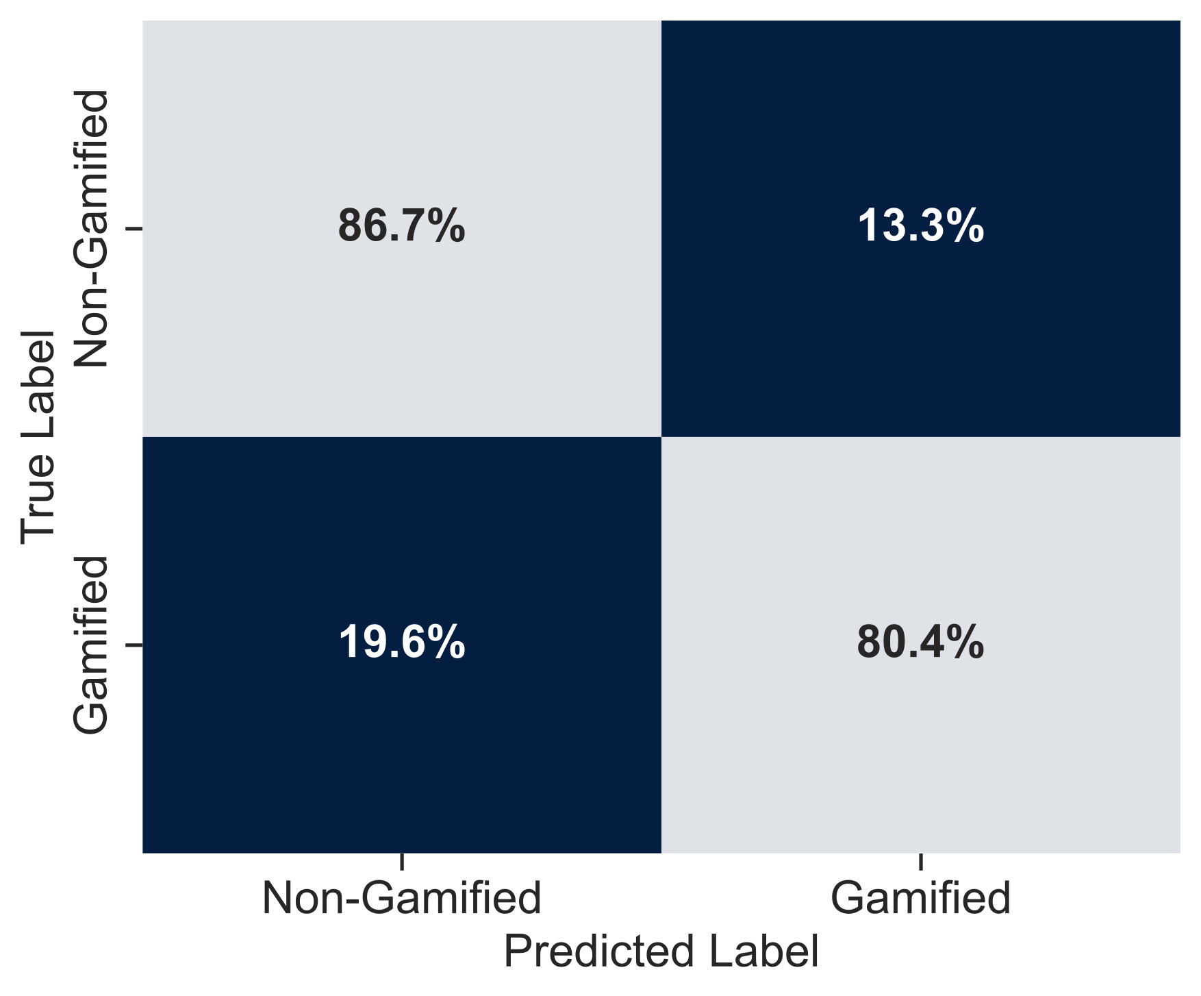 To address the third purpose, namely, analyzing how the extracted features relate to the motivational questionnaire results, subject-wise classification performance was aligned with the self-reported motivational measures. Interestingly, participants for whom the classifier failed to reliably distinguish the scenarios (i.e., low F1-scores) reported the largest motivational difference between the conditions, specifically, higher IM in the Gamified scenario. In contrast, a majority of participants who were classified perfectly reported no apparent motivational differences between scenarios based on the questionnaires. Overall, no consistent relationship between classification accuracy and reported IM or perceived need fulfillment was observed.