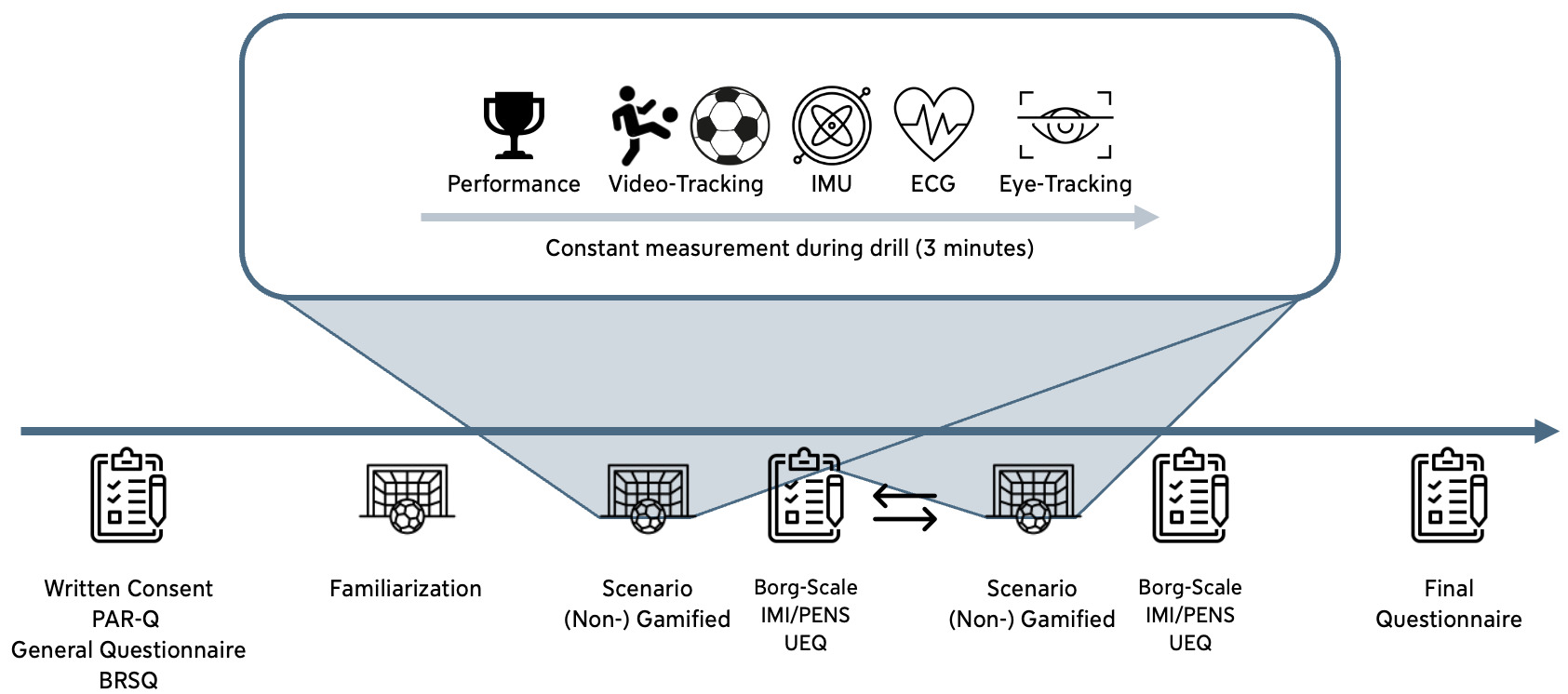 The reviewed research highlights the importance of IM in sports, as it directly impacts performance and persistence. Additionally, the use of wearable sensors for capturing biosignals and behavioral data has demonstrated potential as an objective, real-time measurement tool in psychological research. To investigate whether wearable sensors can effectively assess motivation in high-intensity sports activities, we implemented a soccer drill within an immersive environment known as the Igloo (Igloo Vision Ltd., Shropshire, UK), a 360° projection system with a six-meter-diameter circular space covered in artificial turf, integrating virtual and real-world elements. Projectors create an interactive environment simulating a passing drill, allowing participants to engage with a real soccer ball that can be passed against a rebound barrier positioned along the edge of the space. This setup was chosen primarily for its high level of experimental control and standardizability, enabling the precise implementation of gamification elements based on SDT to systematically influence the player’s motivation. Although the drill addressed relevant soccer-related skills such as scanning behavior and decision making, while preserving natural movement patterns and realistic ball interaction, it was not intended to directly assess soccer performance.